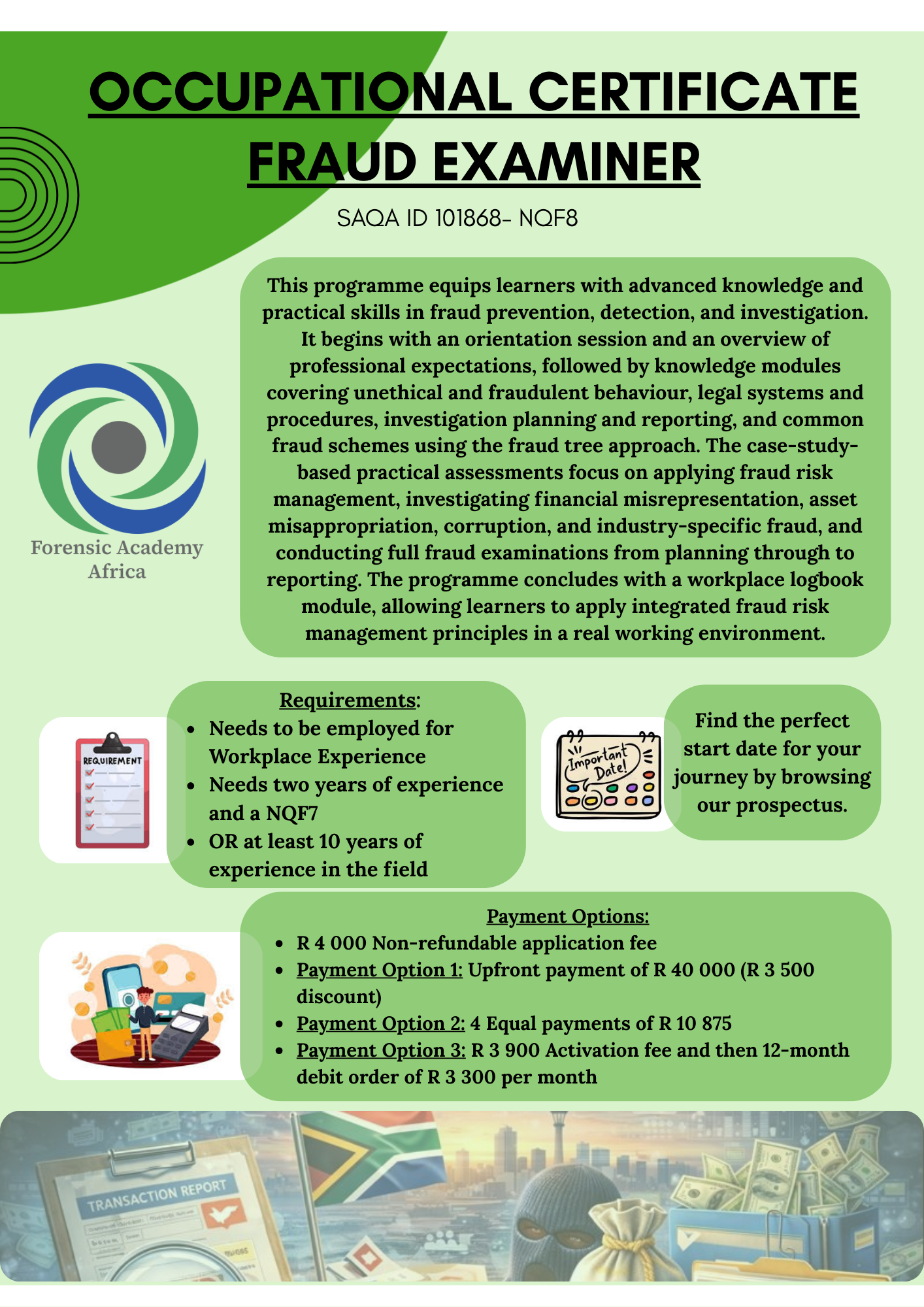 Discover the brave world of the fraud examiner ensuing the “Fraud Examiner: Proactively Approaching Prevention, Detection, and Investigation” modules leading to achieving the Occupational Certificate: Fraud Examiner, a SAQA registered qualification, ID 101868, on NQF level 8.