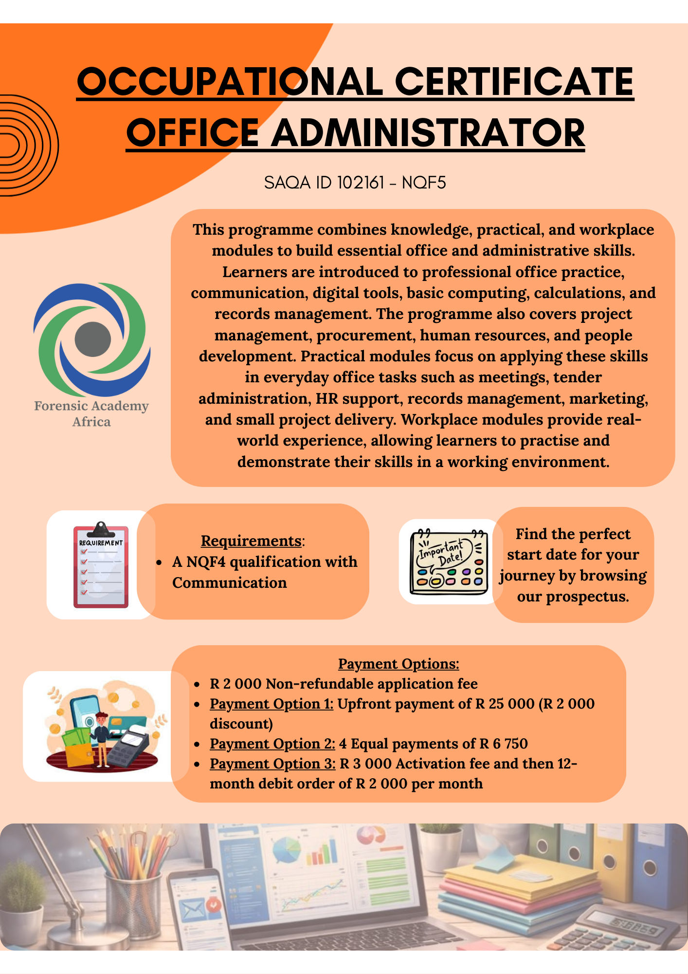 The “Office Administrator: People, Process & Systems” modules lead to achieving the Occupational Certificate: Office Administrator, a SAQA-registered qualification, ID 102161, on NQF level 5.